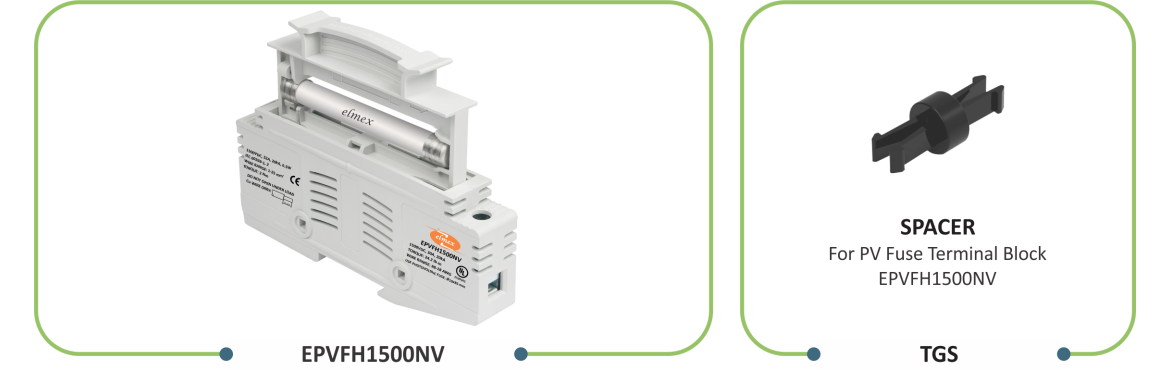 elmex PV Solar Fuse Terminal Block EPVFH1500NV is suitable for photovoltaic application and applicable for string protection. It is designed for use in connection for photovoltaic devices like DC and AC Distribution Box, Inverter , String Combiner Box, etc. which is used for rooftop or ground mounted projects. The fuse terminal block is constructed as per standard IEC 60269-1 and are suitable for cylindrical gPV fuse size ø 10 X 85 mm. Fuse Terminal blocks can be mounted along with spacer. The Spacer creates gap between adjacent fuse holders and this gap allows circulation thereby reducing operating temperature.